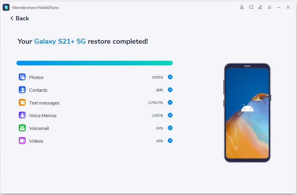 После этого просто сядьте и подождите несколько минут, пока выбранный контент будет перемещен на ваш телефон Samsung. Когда процесс будет завершен, вы получите уведомление, так что вы можете безопасно удалить оба телефона.