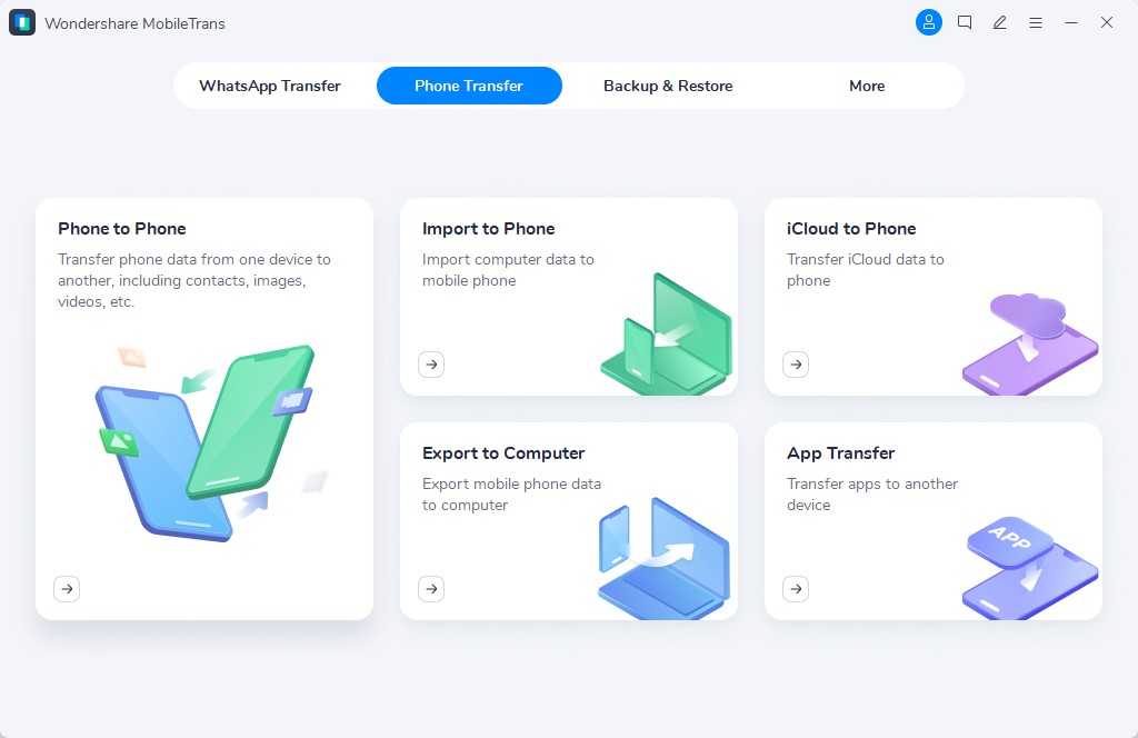 Во-первых, установите приложение MobileTrans на свой Windows или Mac, посетив его веб-сайт, и запустите его для передачи ваших данных. Из предоставленных опций на своем домашнем сайте нажмите на решение “Перенос данных телефона”.