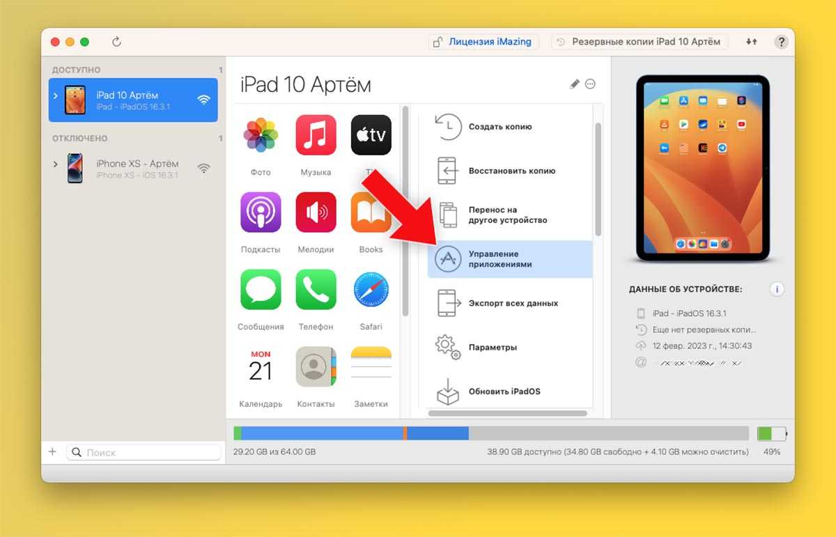Выберите свой гаджет в боковой панели и откройте раздел Управление приложениями.