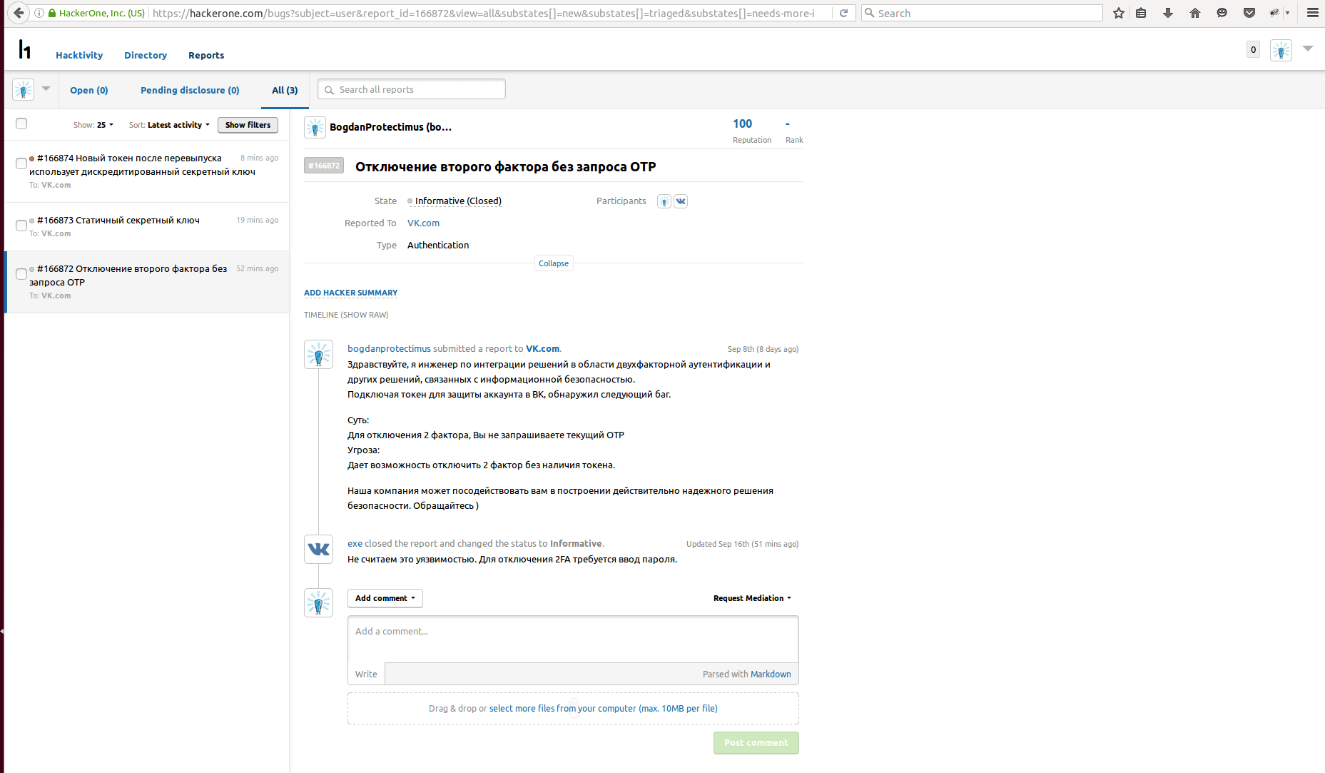 Если бы не был исправлен баг с перевыпуском токена, когда при повторном выпуске токена секретный ключ не менялся, ситуация могла бы стать еще интересней! Ваш коллега, уже зная пароль, мог бы отключить 2FA, после чего опять подключить двухфакторную аутентификацию, увидел бы при этом секретный ключ, выпустил бы себе токен, идентичный вашему, и мог бы читать ваши сообщения до тех пор, пока жив ваш аккаунт.