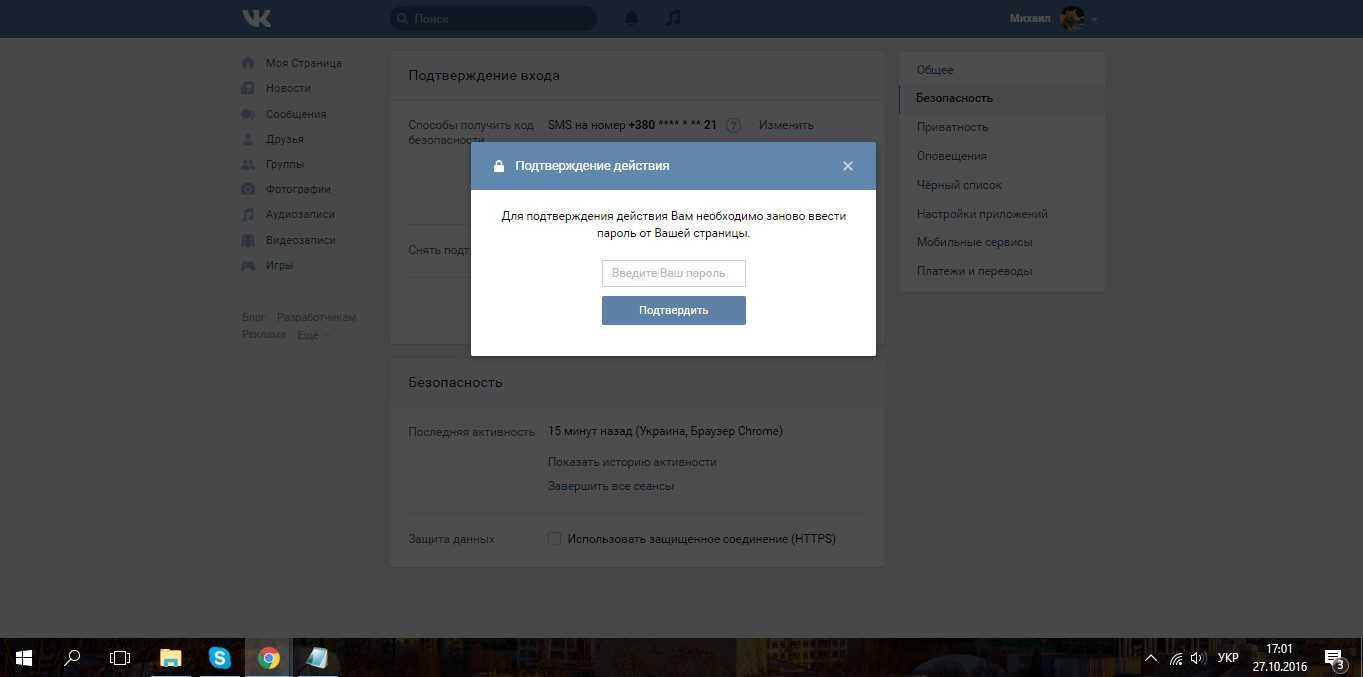 Вас попросят заново ввести пароль от страницы (см. как поменять пароль в контакте). Сделайте это и нажмите кнопку «Подтвердить».