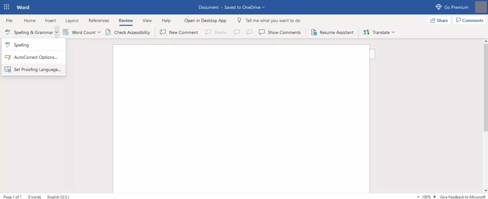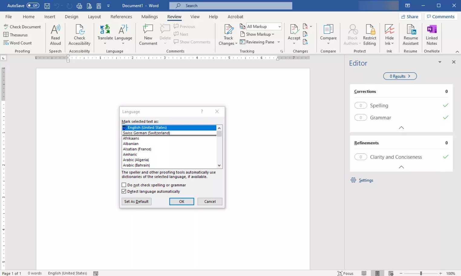- Язык проверки: Или тот, который входит в игру, когда вы проверяете свой документ для написания и грамматики.