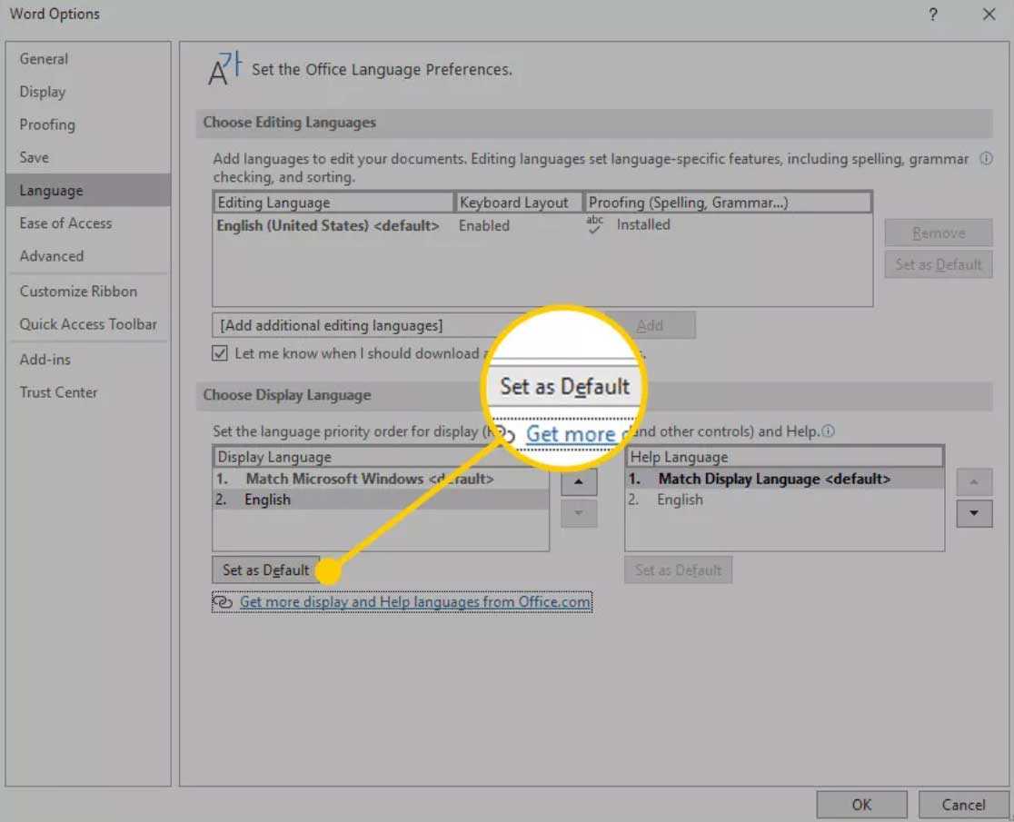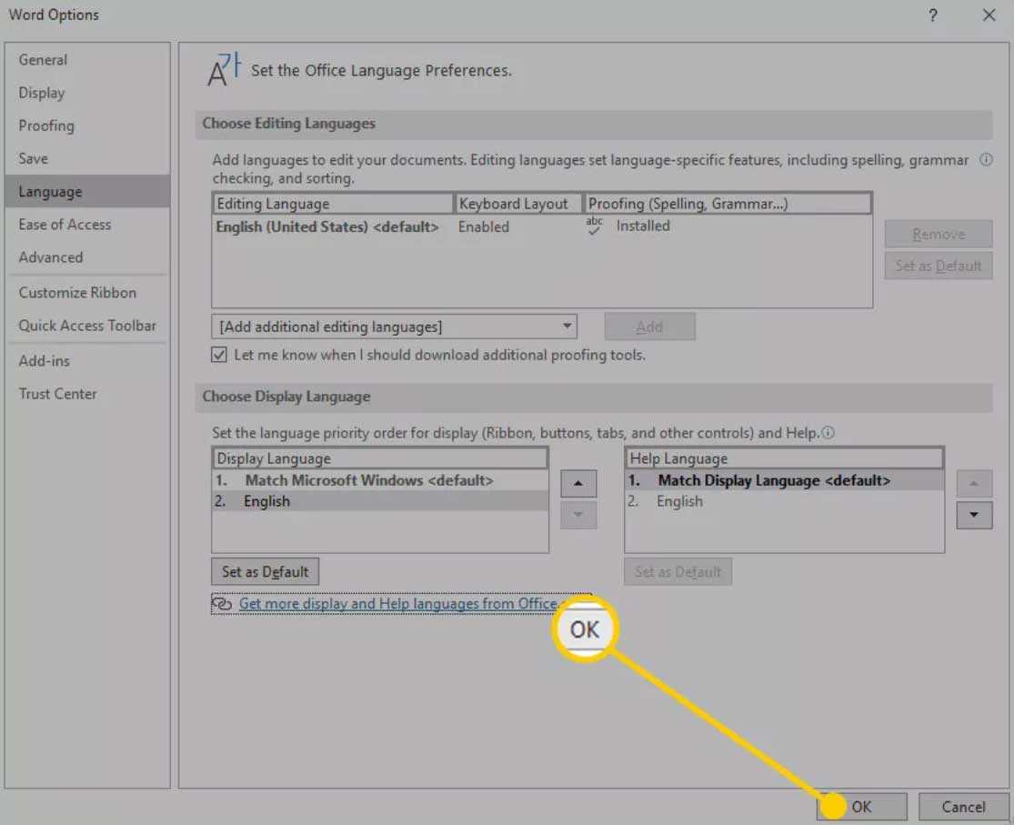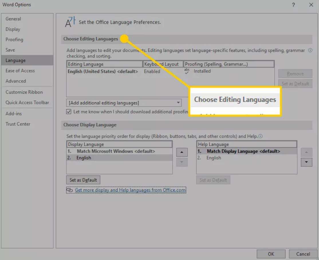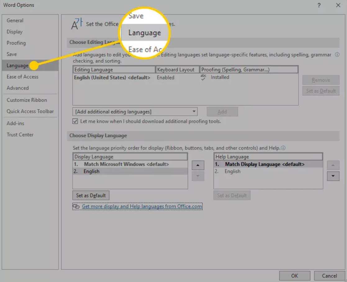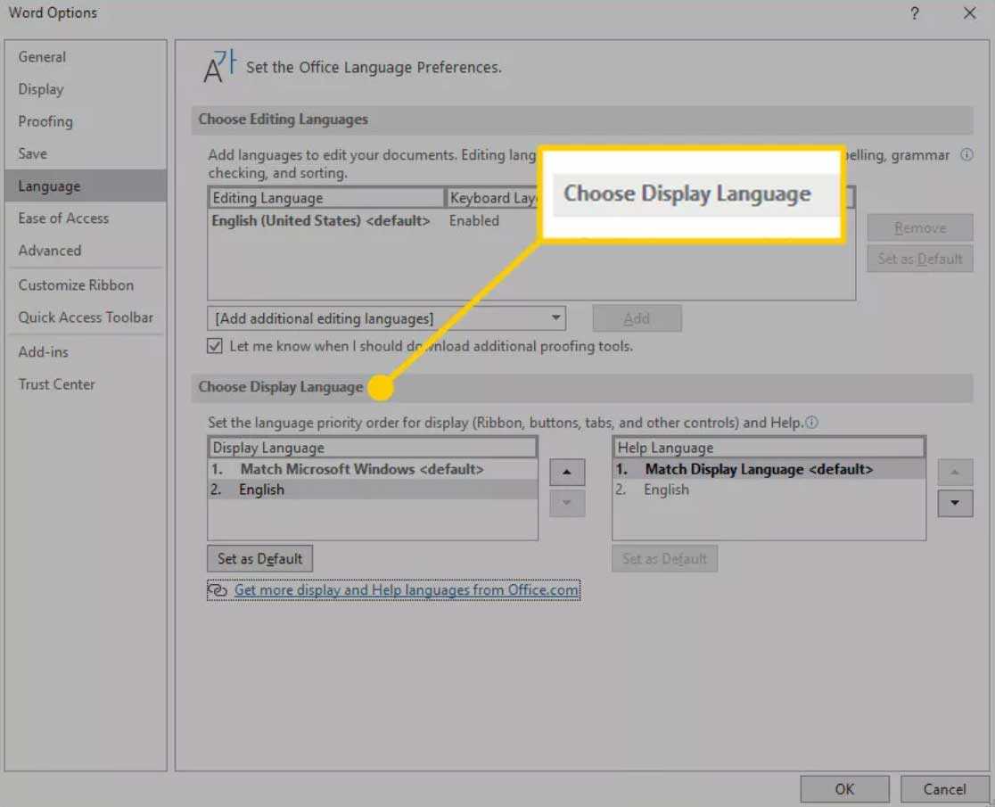 - Язык отображения: Иногда называется языком пользовательского интерфейса (UI), который относится к языку, используемому в элементах управления, меню и кнопках в приложениях Office.