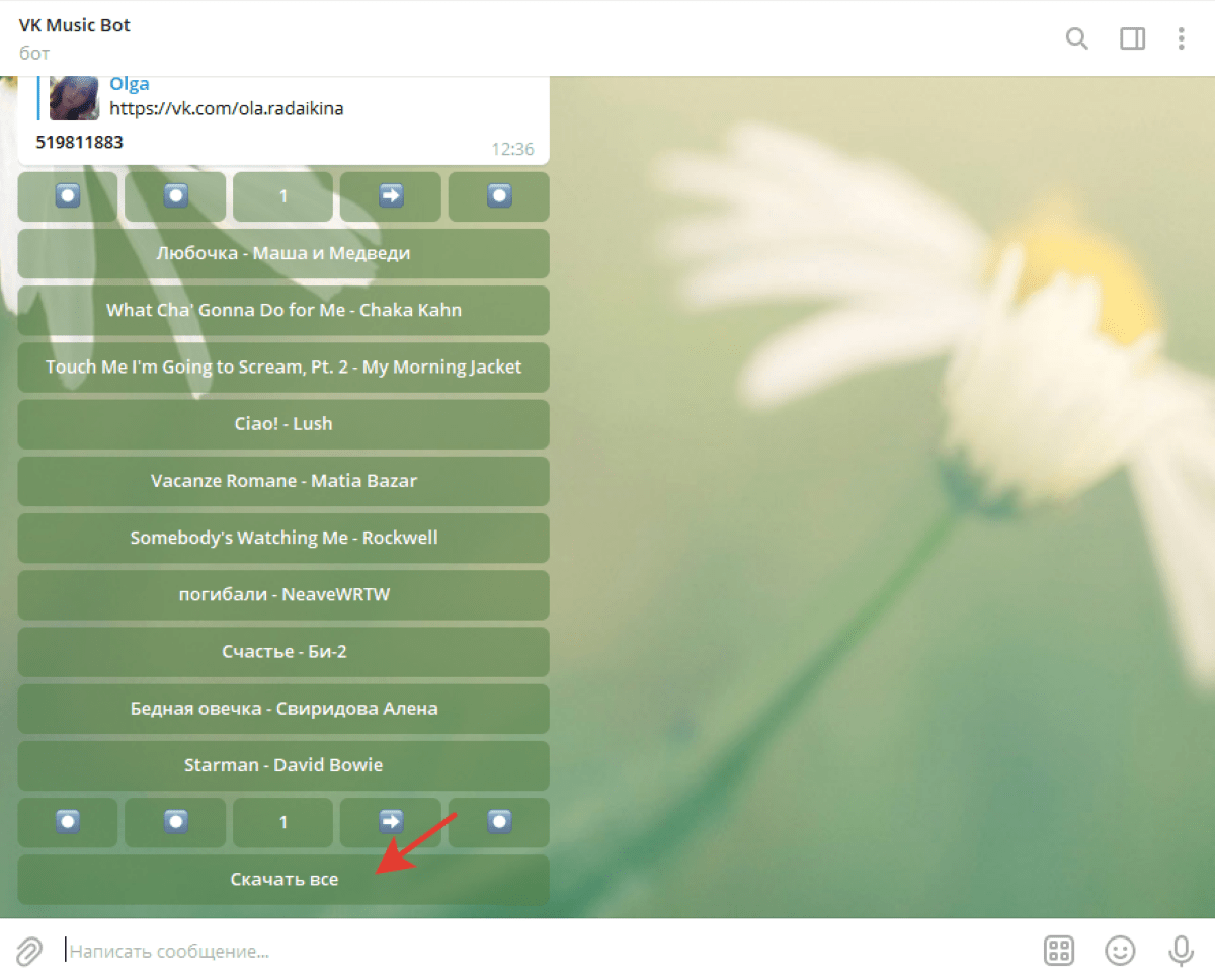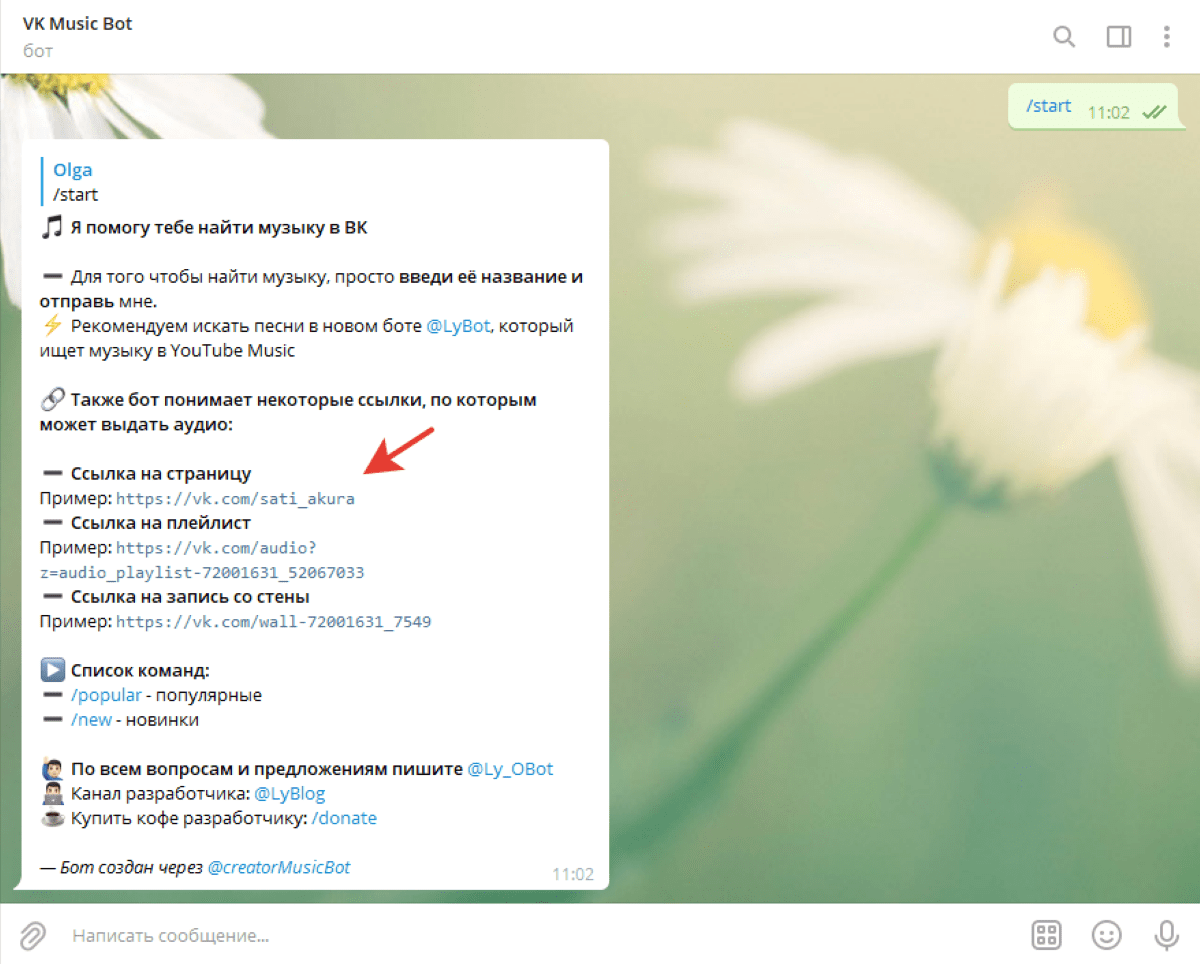 Бот отправит подробную инструкцию по использованию. Нам нужен пункт с описанием ссылок. Допустим, вы хотите скачать все треки из вашего плейлиста в ВК. Для этого нужно скопировать ссылку на вашу страницу.