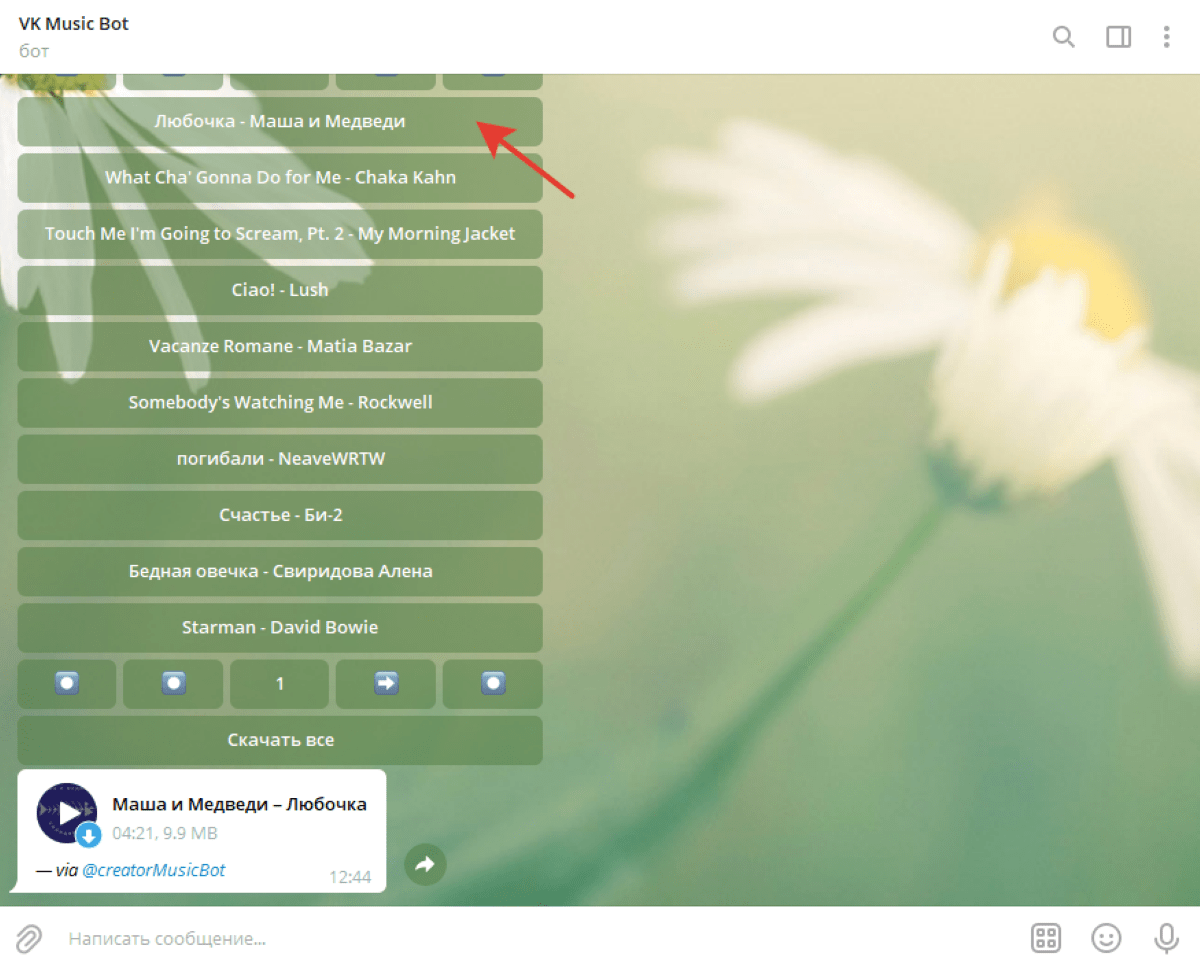 Вам будет доступна вся музыка из ВК. Вы можете скачать все треки при помощи нижней кнопки.
