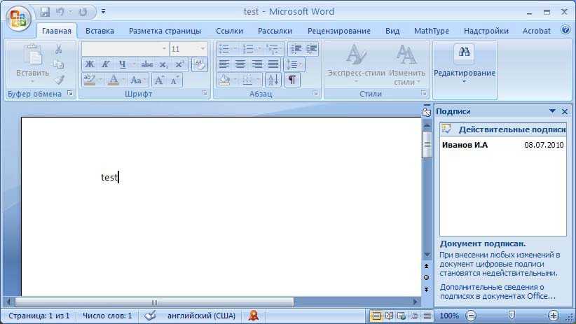 Теперь, если вы хотите узнать, не подписан ли документ «Word», взгляните внизу на строку состояния и удостоверьтесь, что там присутствует иконка цифровой подписи.
