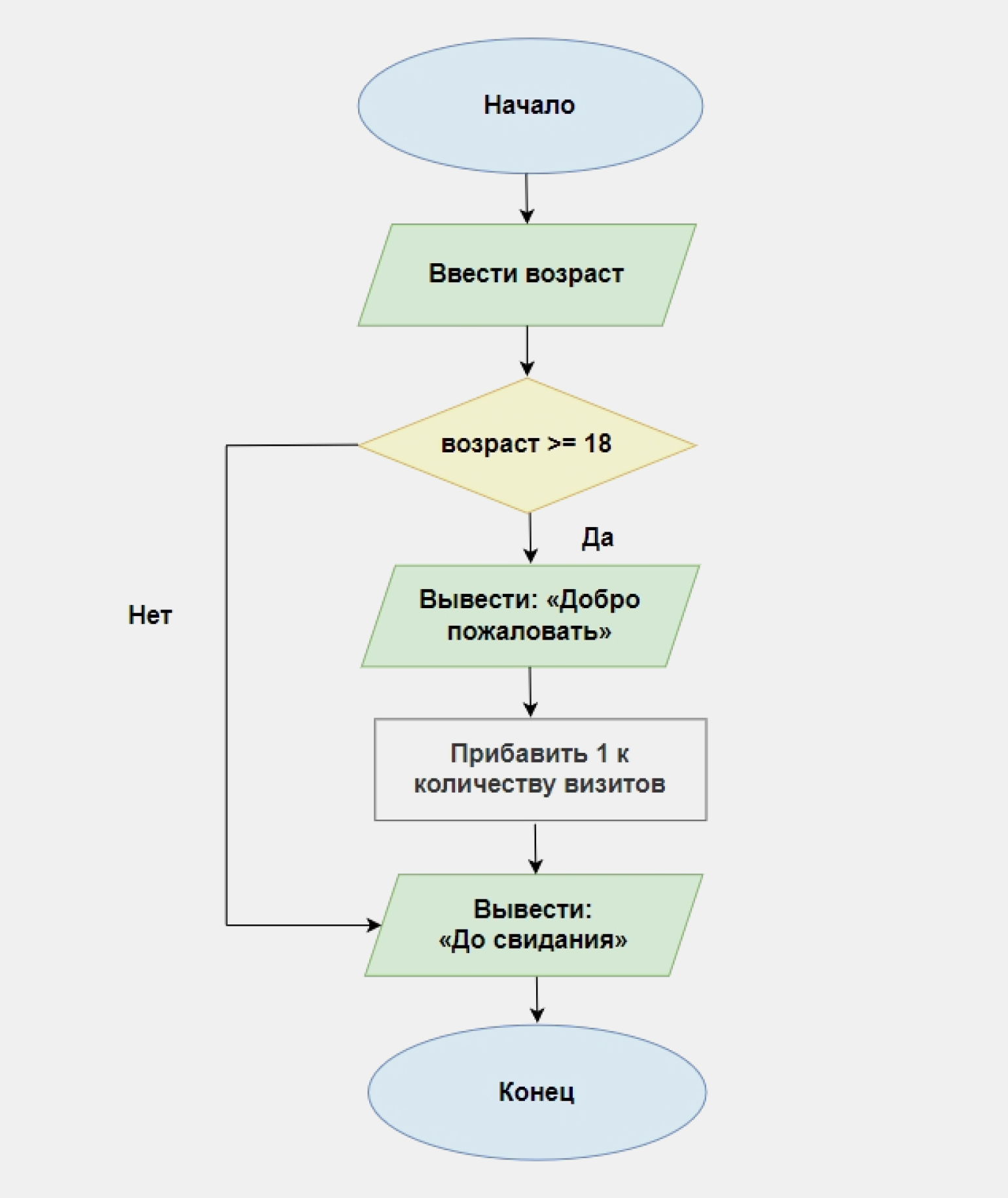 Пример. Напишите программу, которая запрашивает у пользователя возраст. Если он равен или больше 18, программа выводит приветствие, увеличивает значения счётчика посетителей на 1 и прощается, а если меньше — сразу прощается и завершает работу.