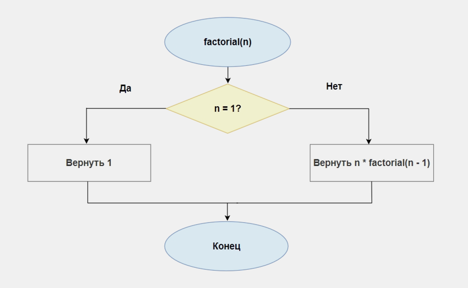 Вот как выглядит блок-схема рекурсивного алгоритма: