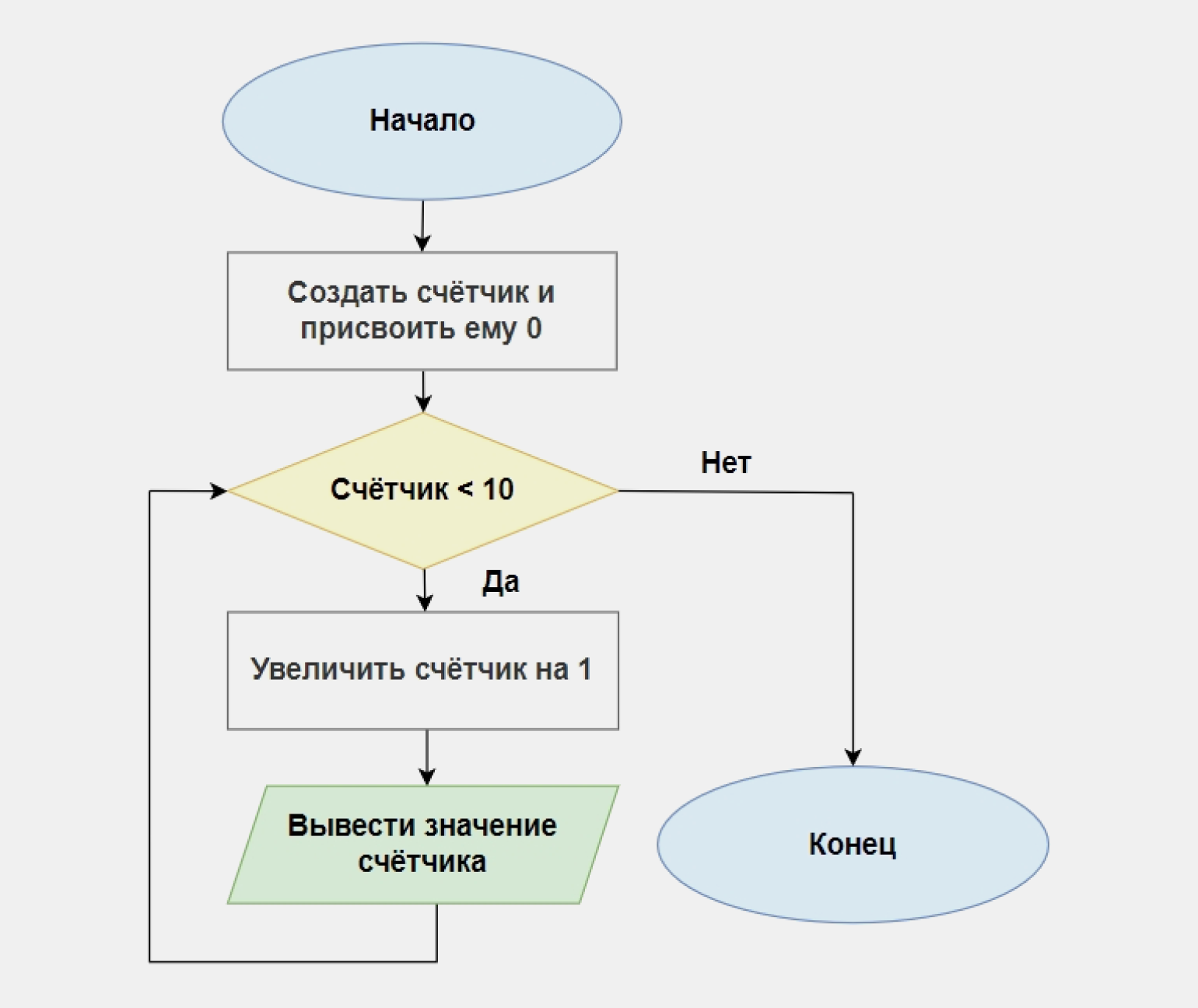 В основе нашего решения будет лежать следующее условие: если значение счётчика меньше 10 — прибавить 1, иначе — завершить работу. Вот как это выглядит в виде блок-схемы: