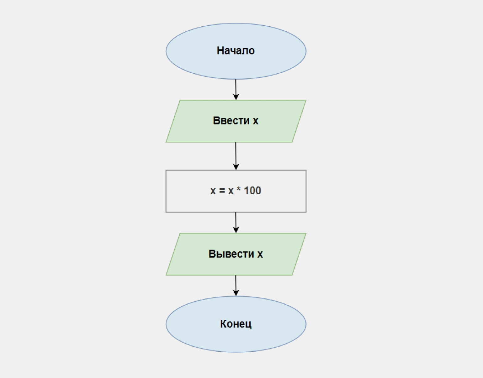 Последовательность действий уже изложена в задании: ввести число → умножить на 100 → вывести результат. Переведём это на язык блок-схем: