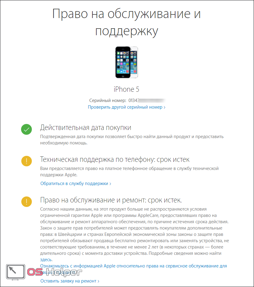 Если продавец утверждает, что iPhone недавно приобретен и подлежит бесплатному гарантийному обслуживанию, то это довольно легко проверить. Вновь необходимо воспользоваться специальным разделом сайта Apple (ссылка), где нужно лишь ввести серийный номер iPhone. Сервис укажет дату приобретения устройства и оставшийся срок бесплатного гарантийного обслуживания.