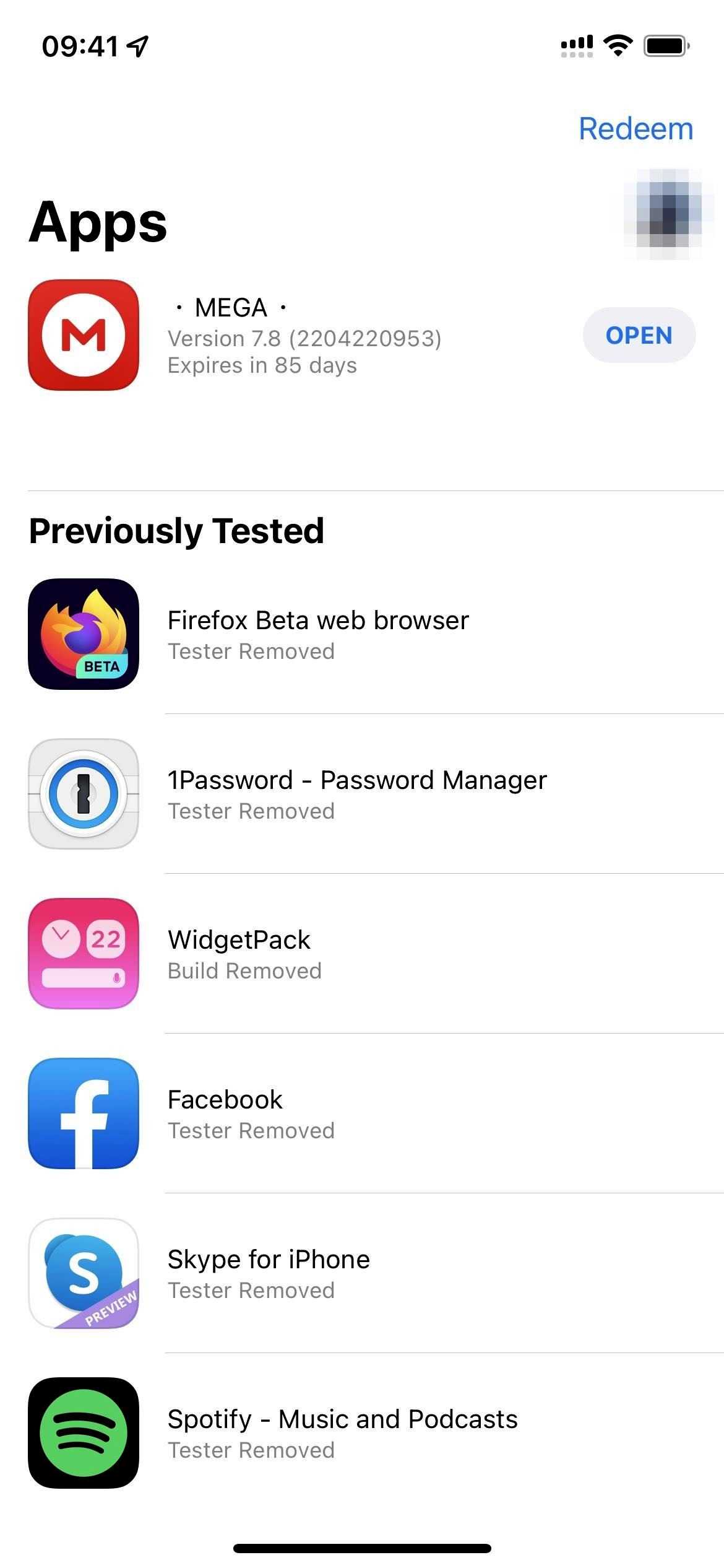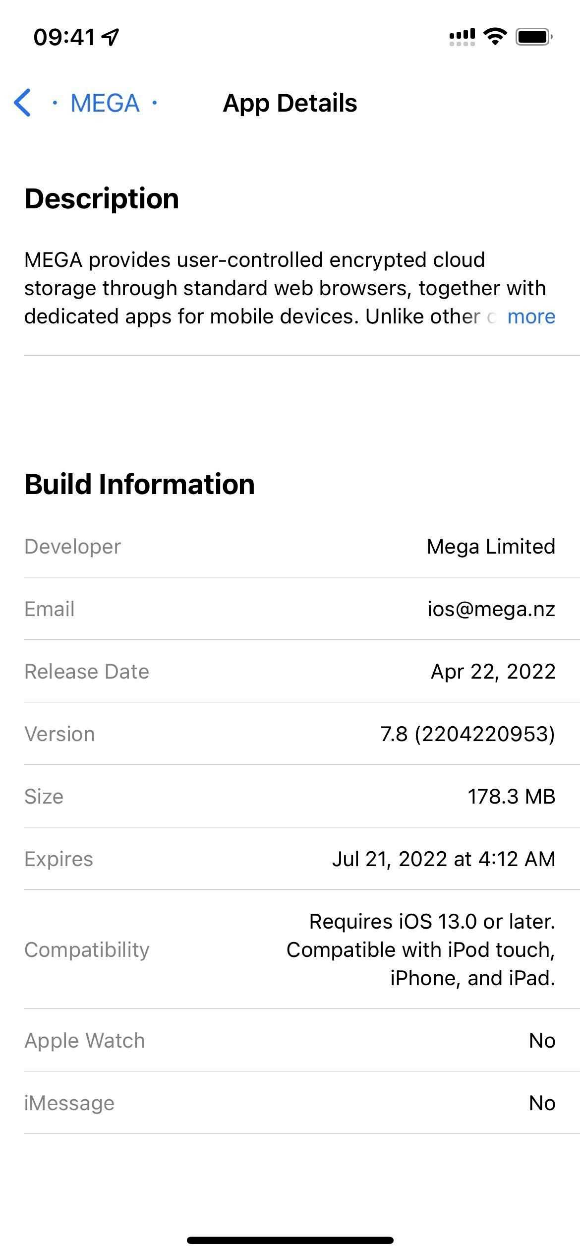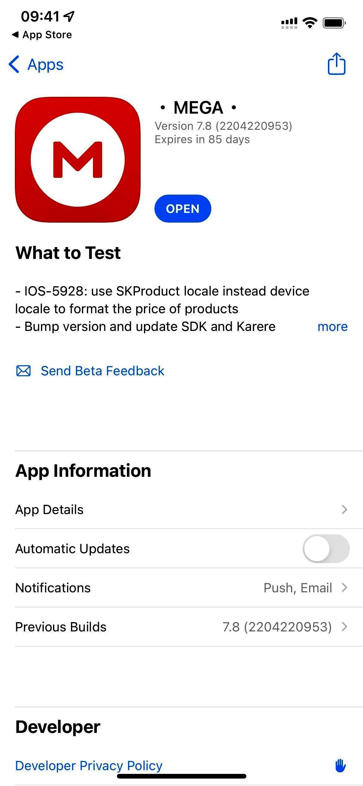 Просмотр номера бета-версии Mega непосредственно из TestFlight.