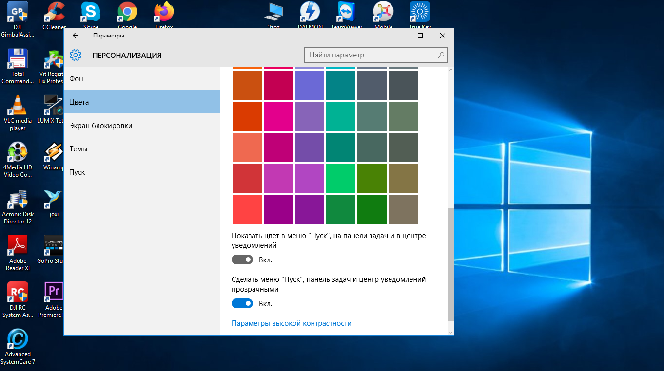 Чтобы получить еще более интересный эффект, добавьте прозрачности. За эту функцию отвечает пункт «Сделать меню «Пуск», Панель задач и центр уведомлений прозрачными».