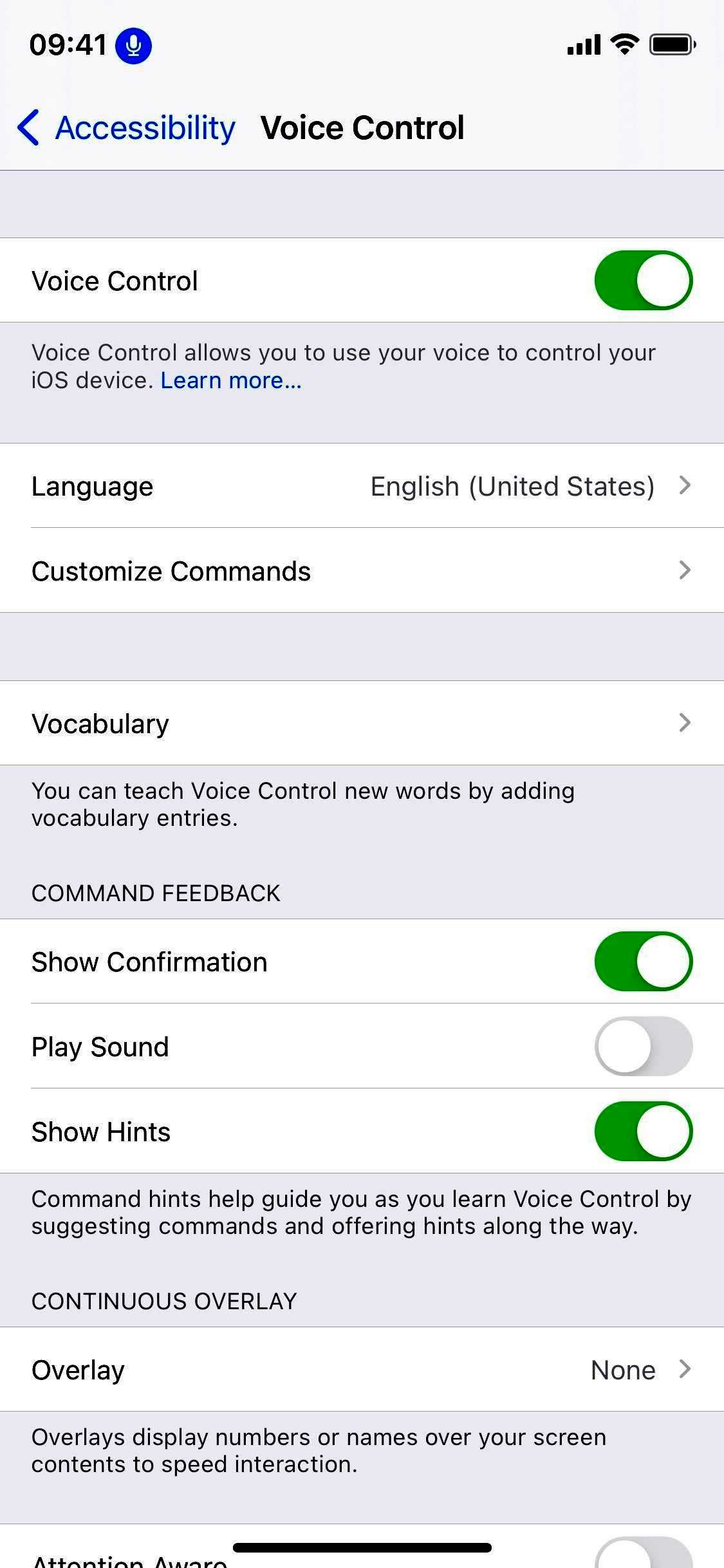 - Перейдите в Настройки -> Специальные возможности -> Голосовое управление, затем включите переключатель «Голосовое управление».