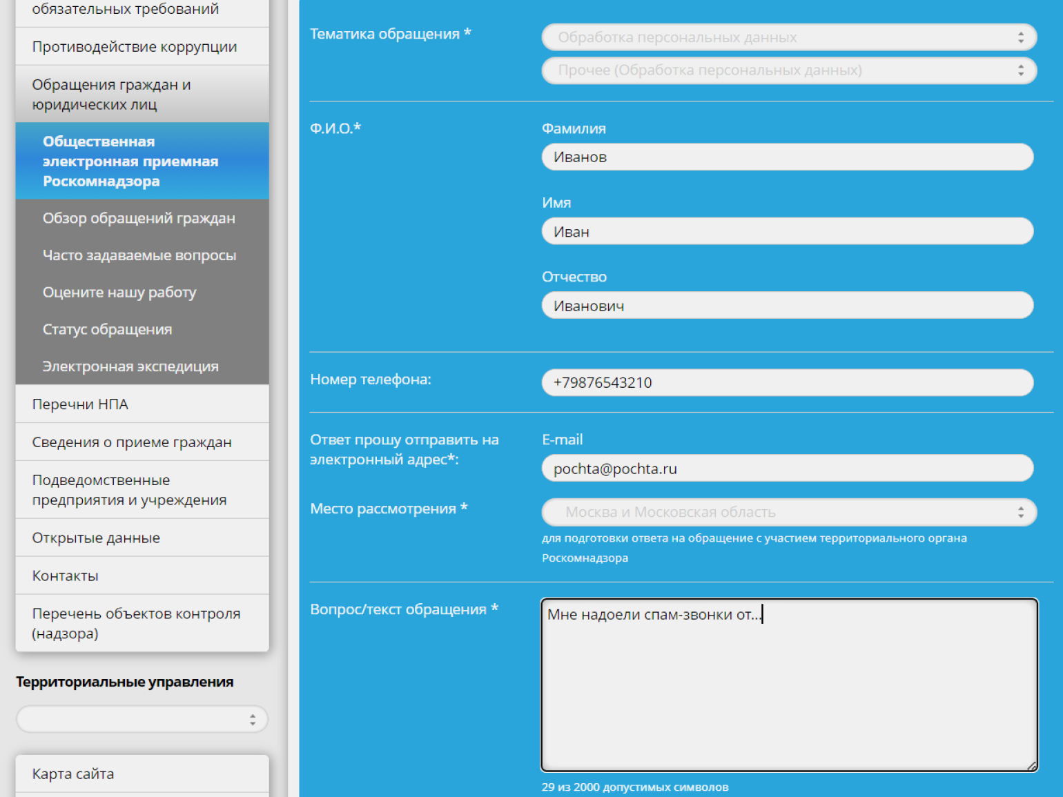 На сайте Роскомнадзора есть форма для обращений. Пострадавший от спама заполняет её и может приложить доказательства — например, запись разговора со спамером.