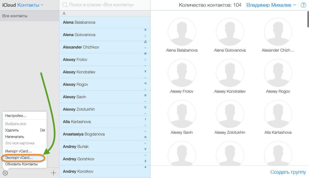 Рис. 13. «Экспорт vCard» в контактах iCloud