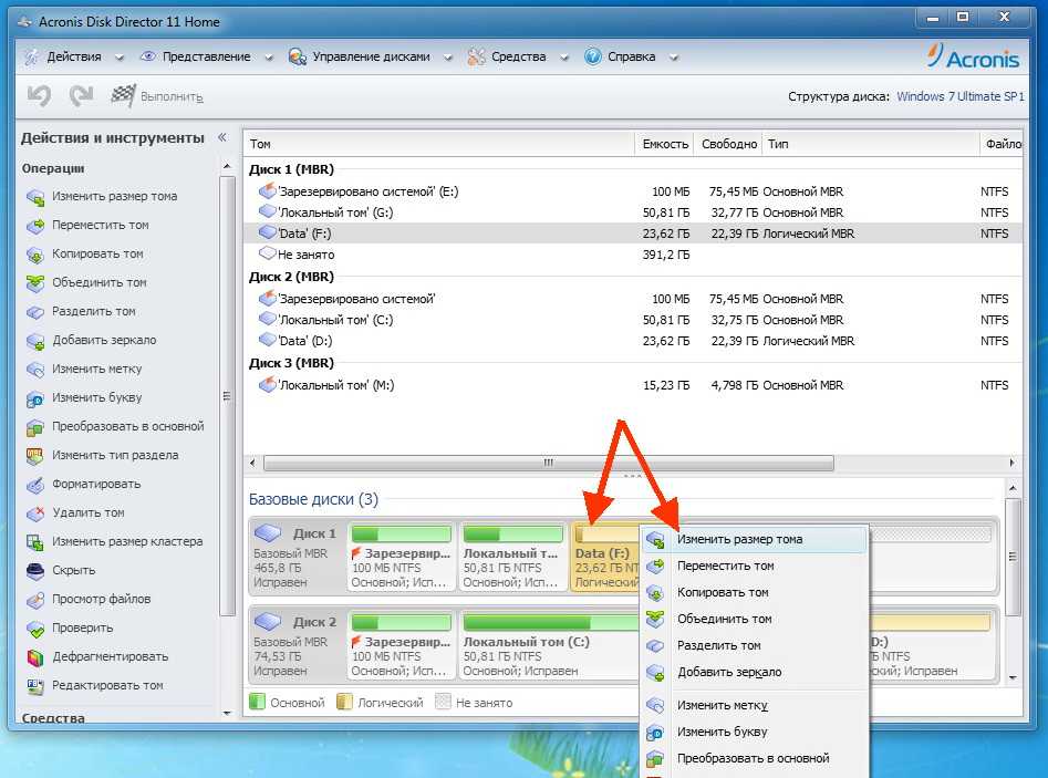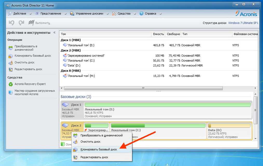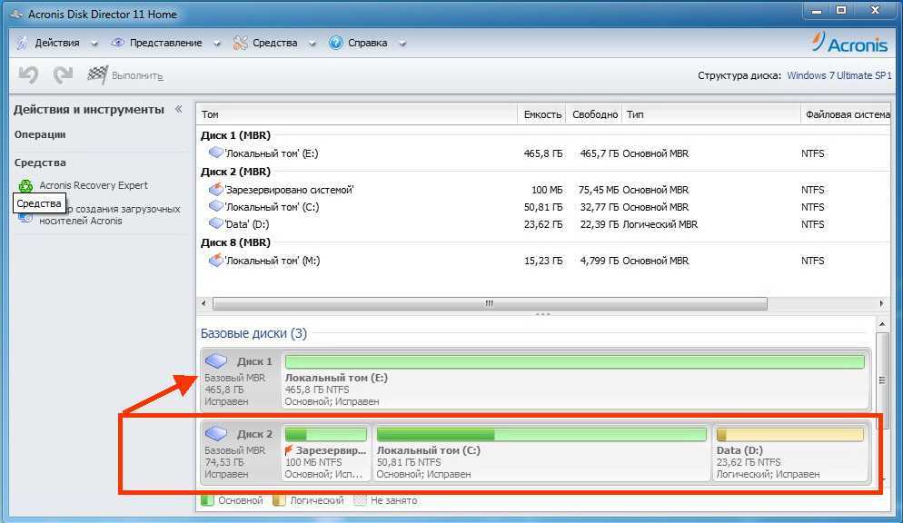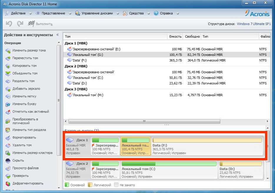 При клонировании данных в настройках можно задать создание тех же жестких дисков, что были на HDD. Давайте рассмотрим процесс их объединения с помощью утилиты «Управление дисками»: