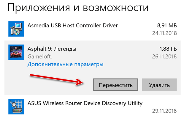 Для этого откройте «Параметры» → «Приложения» → «Приложения и возможности». Нажмите соответствующее приложение и нажмите кнопку Переместить.