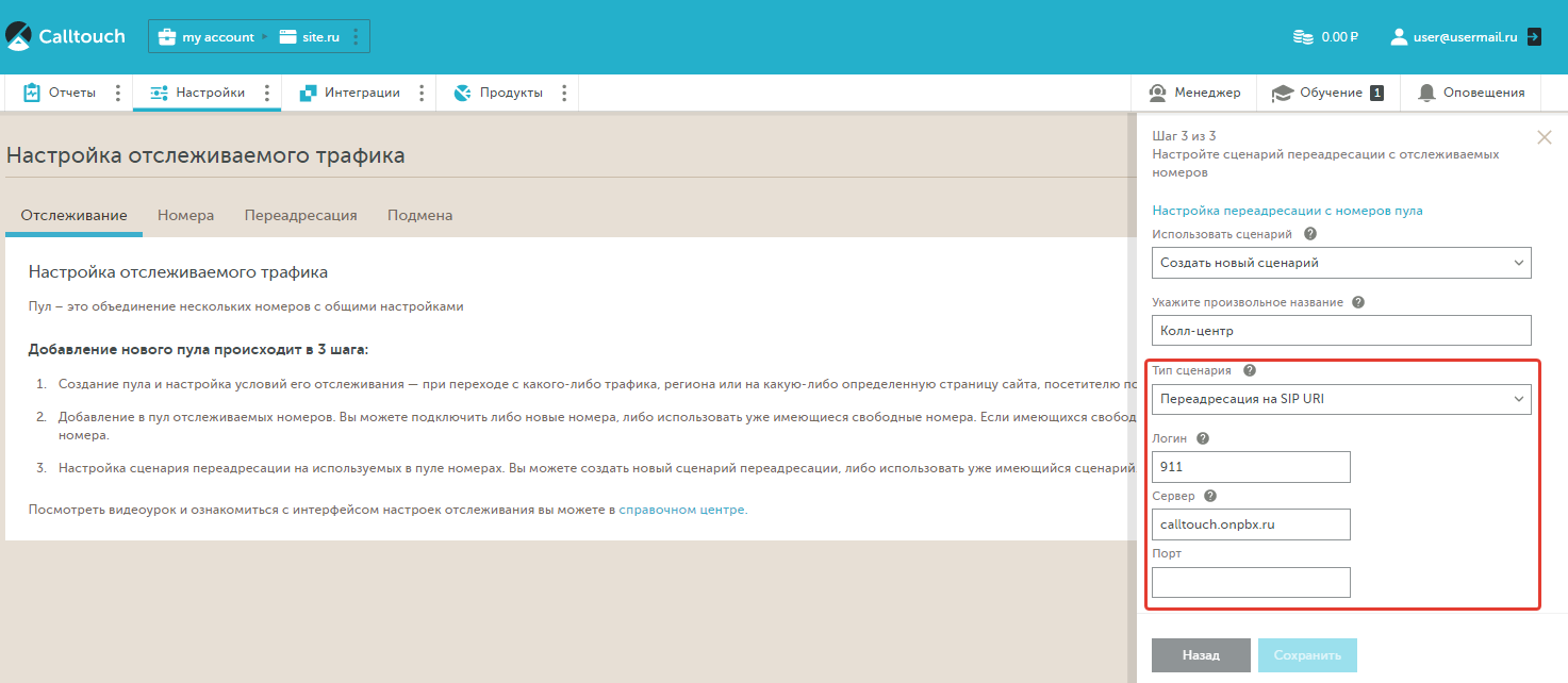 Возможности при редактировании полностью аналогичны настройкам при создании сценария переадресации на шаге 3 добавления нового пула на табе Отслеживание.