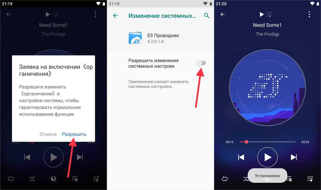 Если появится окно с предупреждением о необходимости предоставить ES Проводнику разрешение, кликните по кнопке «Разрешить» и активируйте переключатель на странице настроек. Вернитесь назад и рингтон будет установлен.