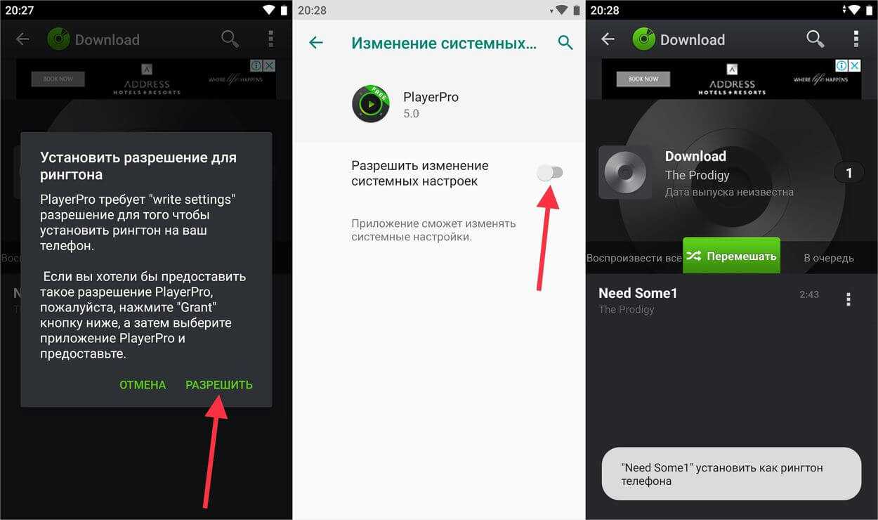 Если появится окно с сообщением, что приложению необходимо предоставить разрешение для установки рингтонов, нажмите «Разрешить». Вас перебросит на страницу настроек. Активируйте тумблер «Разрешить изменение системных настроек» и вернитесь назад. Трек будет установлен в качестве рингтона.