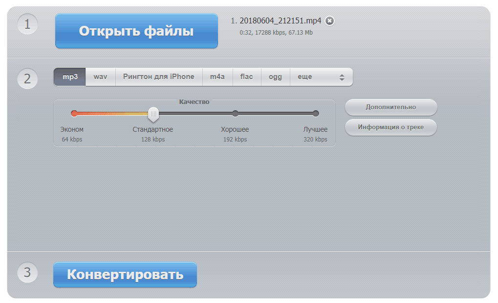 В интерфейсе конвертера выберите формат для извлеченного звука. При нажатии на кнопку “Дополнительно”, доступны параметры качества для сохраняемого аудио: битрейт, частота и другие.