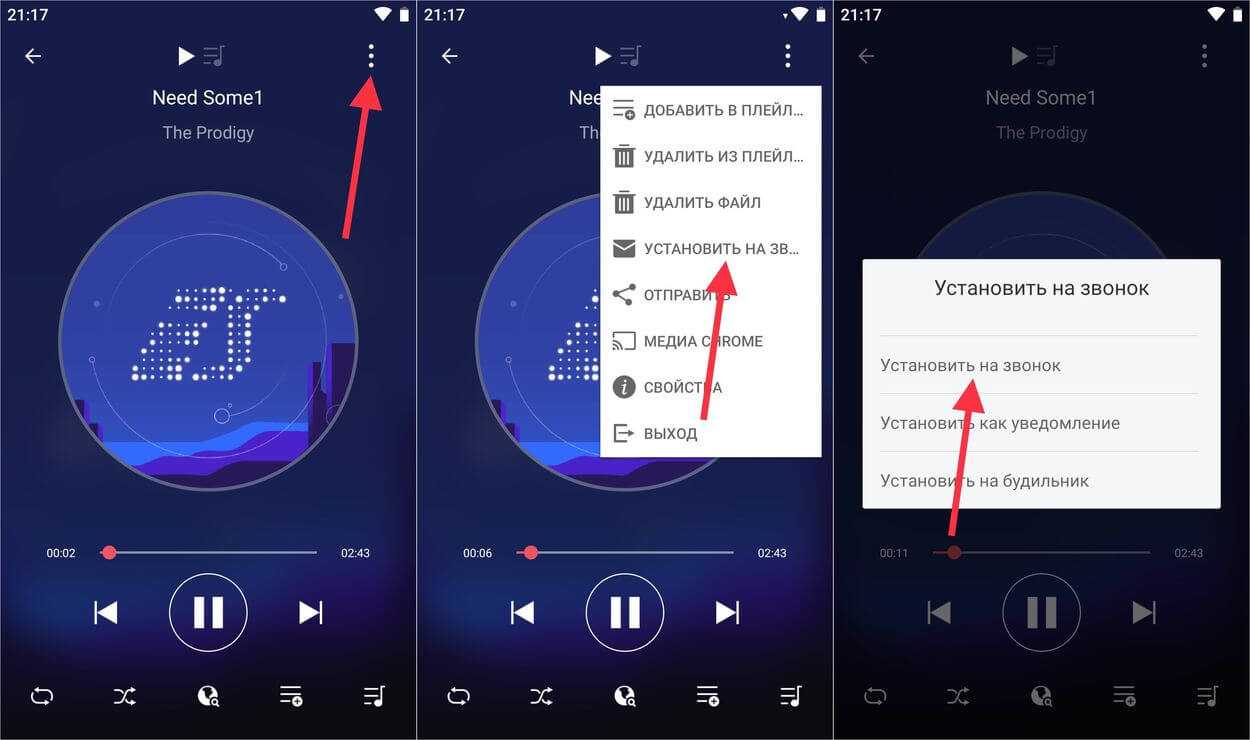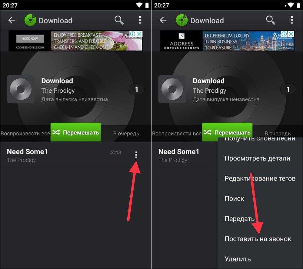 Трек начнет проигрываться. Нажмите на три точки в правом верхнем углу. Раскроется меню с опциями – выберите в нем пункт «Установить на звонок». Во всплывающем окне также выберите «Установить на звонок».