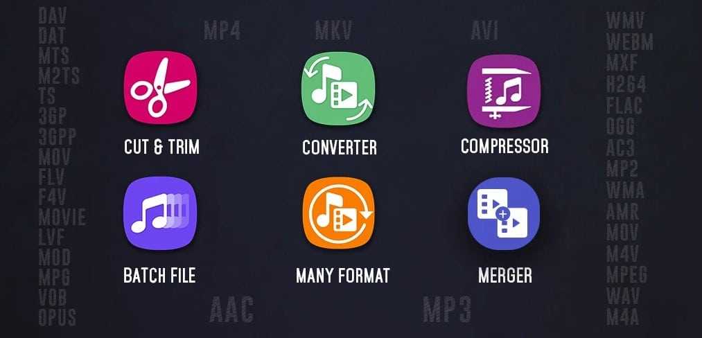 Video Converter — один из самых популярных инструментов. Извлечь звук из видео приложение способно за считанные секунды, в зависимости от продолжительности ролика. Среди дополнительных возможностей: обрезка, склейка видео и аудио. Поддерживает все популярные форматы звука: MP3, M4A(AAC), M4B(AAC), AC3, WAV, OGG, FLAC. Отзывы о приложении исключительно положительные. Однако здесь есть реклама, чтобы ее отключить, нужно покупать платную версию, но это не обязательно.