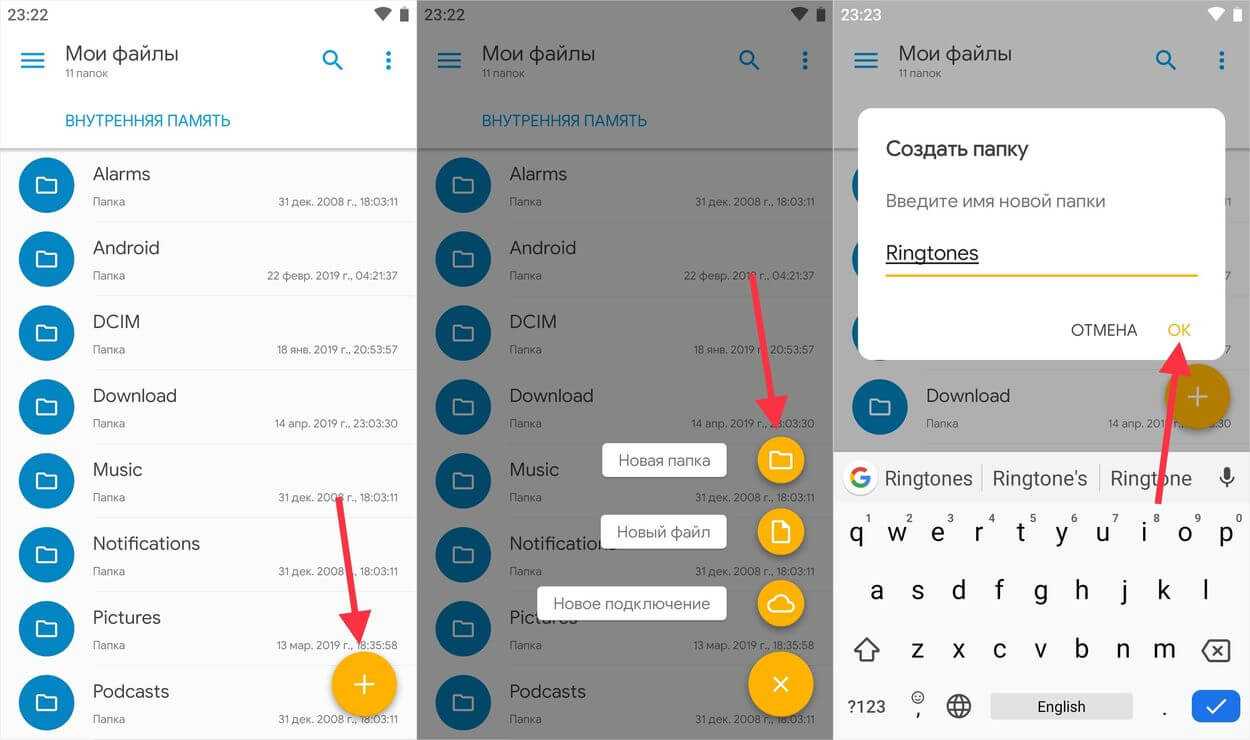 Для этого, находясь в корневом каталоге, щелкните на «+» в правом нижнем углу Solid Explorer и выберите «Новая папка». Затем введите «Ringtones» и нажмите «ОК» чтобы сохранить.
