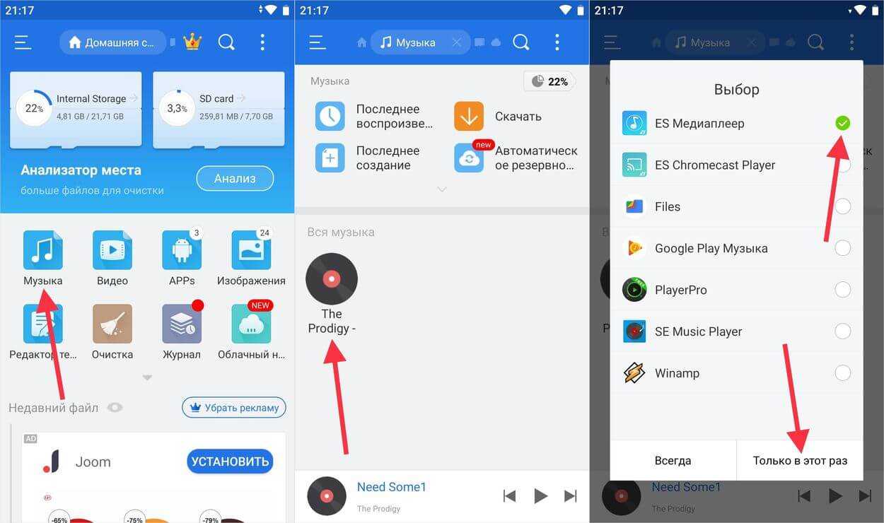 Перейдите на главный экран приложения и откройте раздел «Музыка». Кликните по нужному треку, выберите «ES Медиаплеер» и щелкните по кнопке «Только в этот раз».