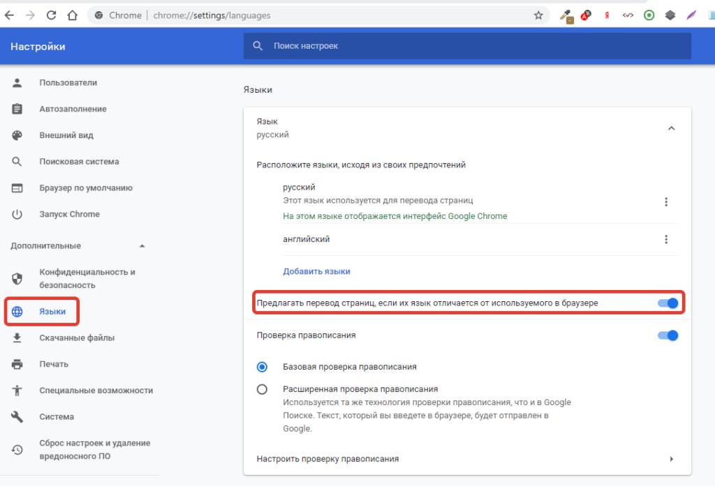 В настройках браузера, перейдите в пункт «Языки» и проверьте, включено ли опция «Предлагать перевести страницы на других языках»