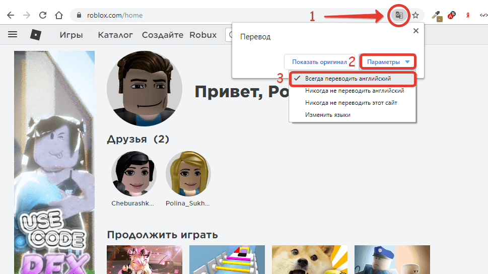 - Чтобы браузер все время переводил на русский язык игру Роблокс, нажмите в уведомлении кнопку с тремя точками. И выберите строку Всегда переводить английский.