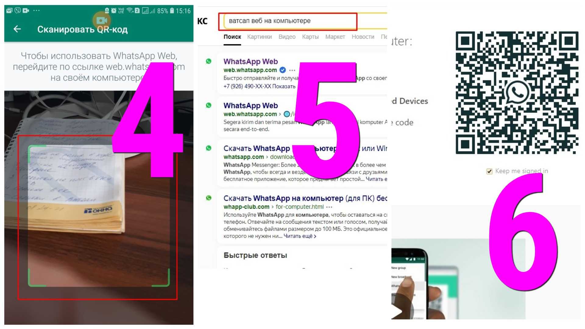 Совместив окно сканера на смартфоне с кодом на экране компьютера, вы попадете в свой мессенджер ватсап.