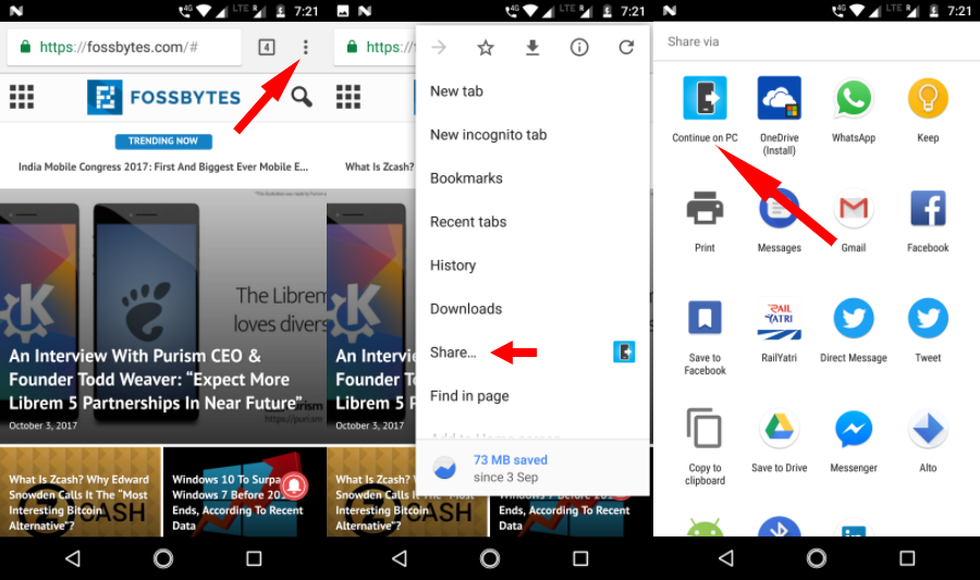 You can use the feature on other apps. For instance, visit any web page in Google Chrome and open the Share section by tapping the Settings button. Here, you’ll find the Continue on PC option which works the same way as mentioned earlier.