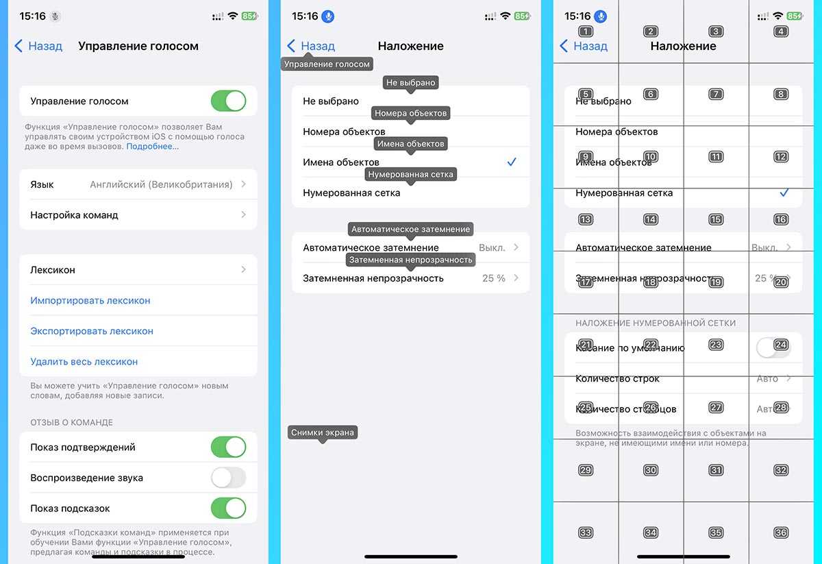 Как включить и пользоваться: откройте раздел Настройки — Универсальный доступ — Управление голосом и включите опцию. Ниже сможете выбрать язык, задать свои голосовые команды и включить метод подсвечивания объектов.