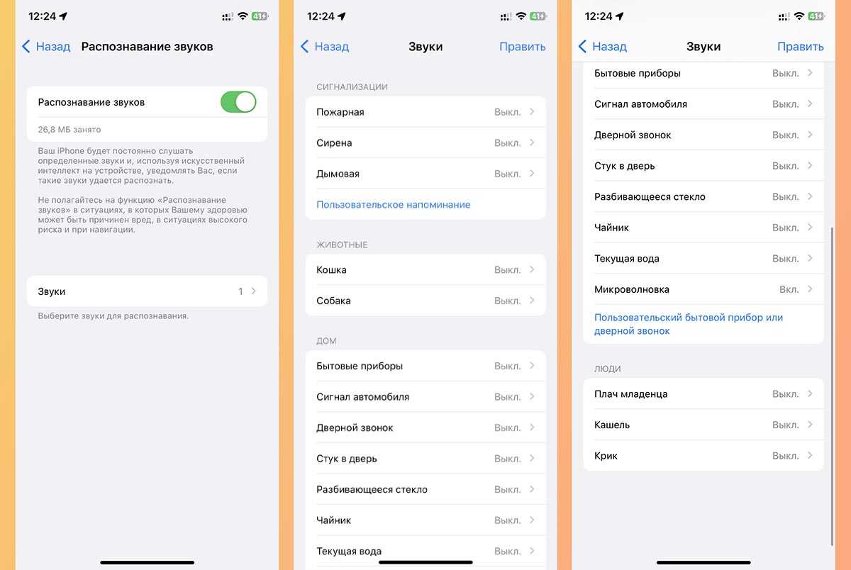 Фишка позволяет задавать несколько нужных для отслеживания звуков и будет выводить уведомление при появлении любого из них. В iOS 16 появилась возможность обучать систему распознавать уникальные звуки, которые изначально не заданы в системе.