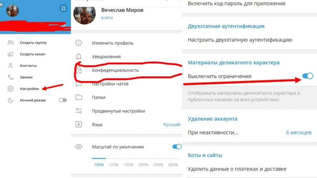- Откройте официальный клиент мессенджера на компьютере – > заходим в раздел настройки – > конфиденциальность – > включаем ползунок выключить материалы деликатного характера – > перезапускаем полностью и приложение и клиент Telegram