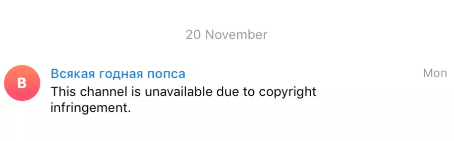 В официальном приложение Telegram для Android и iOS, и компьютерном клиенте, существует ограничение, из-за которого каналы и боты или группы с определённым контентом (тематикой) попросту недоступны для просмотра в мессенджере. В случае со смартфонами Android это касается преимущественно нарушений, связанных с нарушением авторских/смежных прав — мессенджер отображает сообщение «Этот бот/канал/группа недоступен в связи с нарушением авторских прав» («This bot is unavailable due to copyright infringement»), а вместо сообщений указывается «This message couldn’t be displayed on your device due to copyright infringement». На устройствах iOS бывает и другое сообщение: «Этот канал недоступен, так как использовался для распространения …» чаще всего в iOS блокируют контент 18+