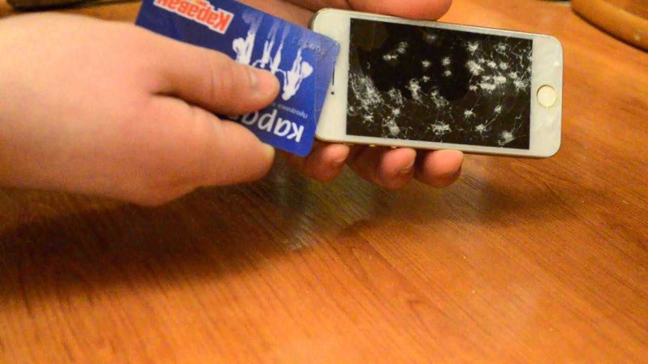 Если поверхность не пострадала, а нужно просто заменить стекло на новое, то помогут две банковские карты. Для отделения поверхности они вставляются по двум разным углам с одной стороны, а затем проводятся по граням, чтобы защита полностью была снята.