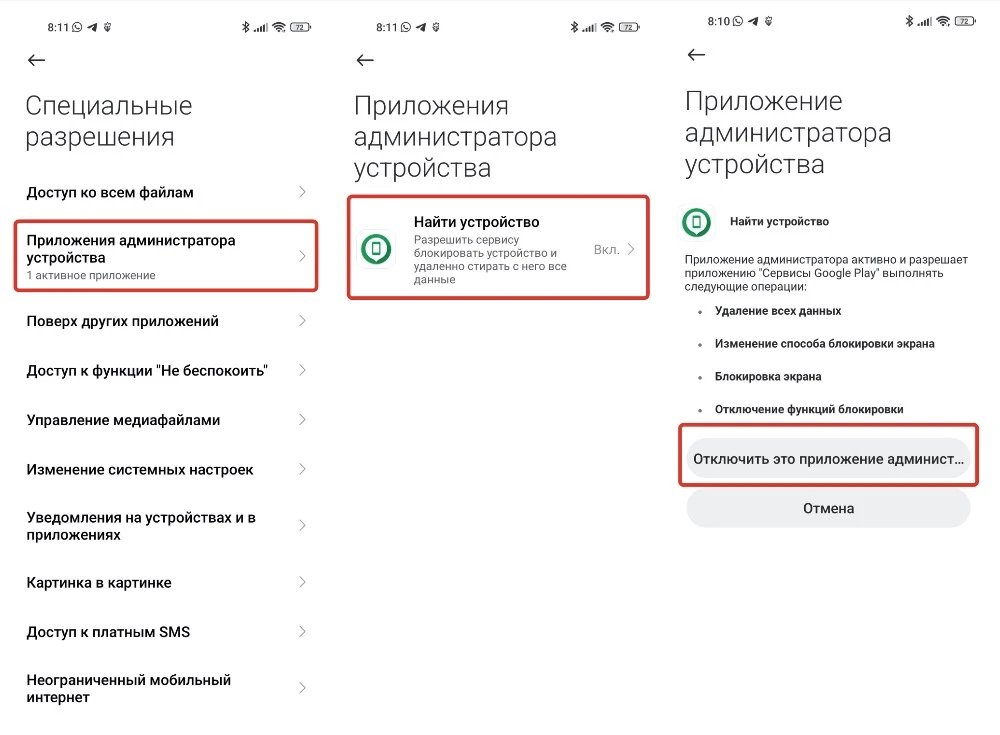 Однако удаление некоторых зараженных приложений может оказаться сложным. При попытке удалить такое приложение, ваш телефон может уведомить вас о том, что приложение является администратором устройства. Приложения с правами администратора могут стирать данные, блокировать телефон, менять тип блокировки и обладать другими привилегиями. Не все приложения имеют такие разрешения, но стоит проверить, не включили ли вы их случайно.