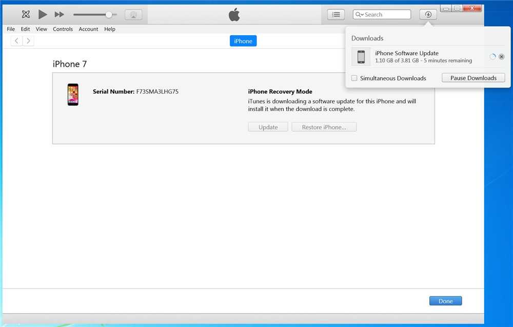Шаг 5. Вы можете увидеть, как iTunes начинает скачивать пакет прошивки, процесс начинается, и должен быть выполнен менее чем за 15 минут.