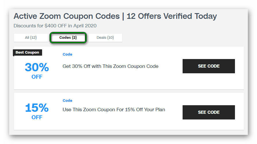 В интернете существует немалое количество сайтов со скидочными купонами для тех или иных сервисов, в том числе и для Zoom. На русском языке их пока что не найти, так что придется пользоваться англоязычными ресурсами. Один из самых популярных среди них — https://coupons.cnn.com/zoom (сервис от всемирно известного зарубежного СМИ CNN). Перейдите по указанной ссылке, посетите раздел Codes и кликните по одному из доступных предложений.