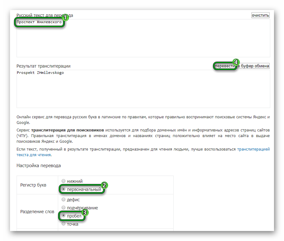 В верхнее поле введите требуемые данные на русском языке. В настройках установите «первоначальный» для Регистра букв и «Пробел» для Разделения слов. Затем нажмите «перевести».Скопируйте итоговый текст на английском и вставьте его в соответствующие строки.