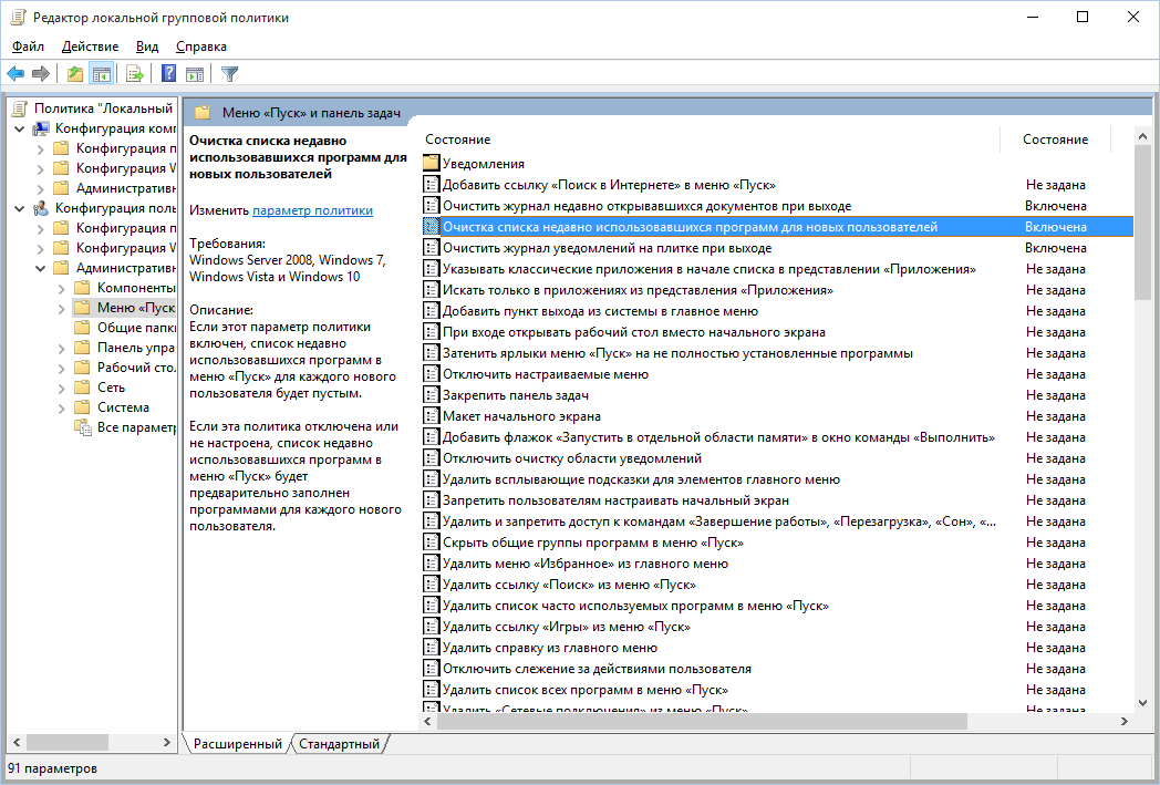 Кажется, что проблема решена, но это, увы, не совсем так. Если включить эти параметры снова, то все списки в таком же составе появятся вновь. Поэтому придется отключать эту фичу через групповую политику. Открой gpedit.msc и перейди в раздел «Конфигурация пользователя\Административные шаблоны\Меню «Пуск» и панель задач». Включи следующие политики: