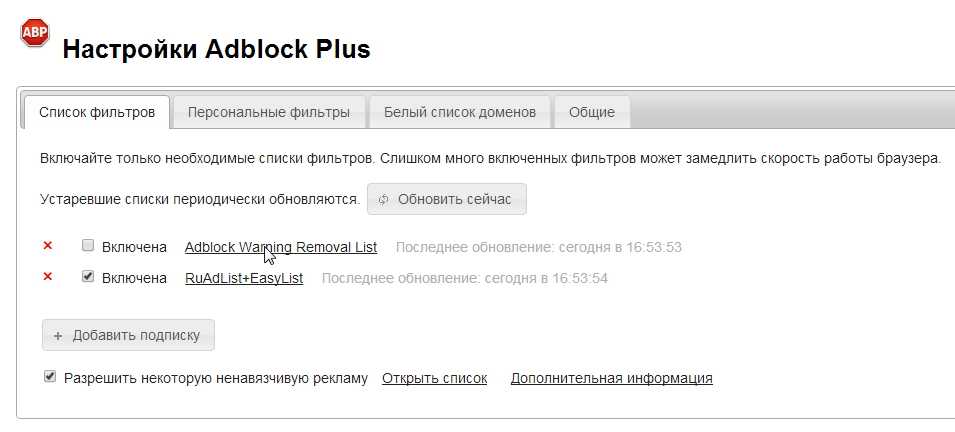 - Подписки: Здесь вы можете добавлять и удалять подписки на фильтры рекламы. Adblock предлагает несколько предустановленных фильтров, а также возможность добавления своих собственных.