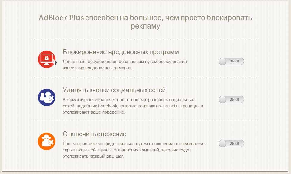 Для более наглядного ознакомления перечислим все возможности дополнения «Adblock plus