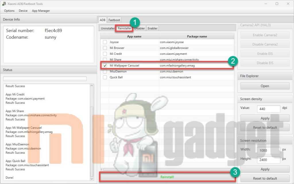 Если в Xiaomi пропала галерея или пользователь удалил её самостоятельно, есть способ вернут всё обратно. В этом случае нам поможет всё та же программа Xiaomi ADB/Fastboot Tool. После подключения телефона к ПК и запуска программы потребуется перейти на вкладку «Reinstaller». Затем необходимо найти в списке удалённых приложений нужное и отметить его путём установки галочки напротив названия.