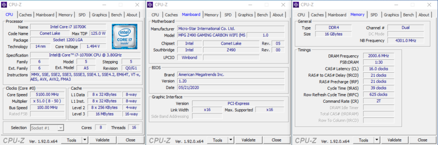 Конечно, тестировать MSI MPG Z490 Gaming Carbon WIFI в стоке нет никакого смысла и материнская плата без проблем справится с любым процессором, поэтому мы сразу перешли к разгону. На данной материнской плате мы получили стабильный разгон Intel Core i7-10700K до 5.1 ГГц (AVX Оffset -1) по всем ядрам при напряжении 1.365В. Память была разогнана до 4000 МГц с таймингами CL16-21-21-39.