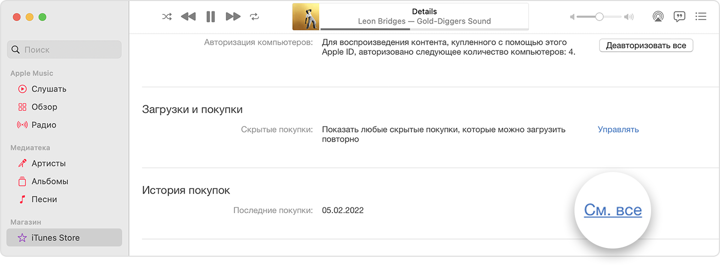 Просмотр истории покупок в App Store, iTunes Store и других медиасервисах Apple