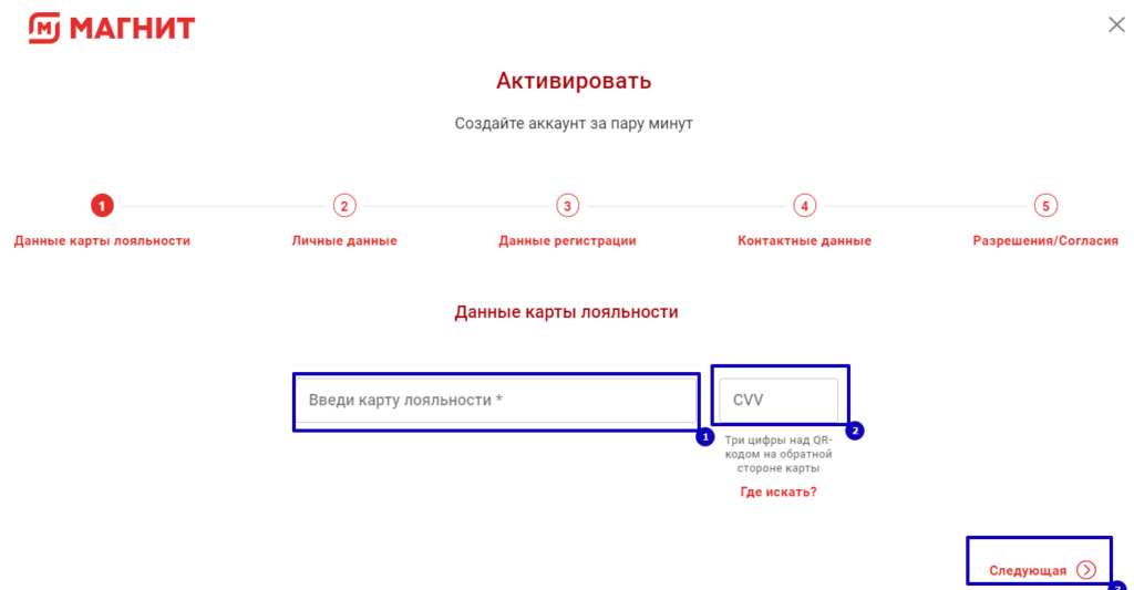 - зайдите из браузера по адресу moy.magnit.ru. Там будет кнопка “Активация”, нажимайте ее, а далее – заполняйте формы с номером телефона, ФИО, днем рождения и номером карты. Также придумайте пароль. Для завершения активации введите пароль из смс, которое поступит на указанный номер телефона;